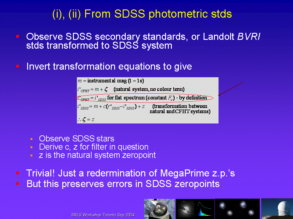 Calibration Procedure - Probably the best procedure is to keep all magnitudes in the MegaCam natural system, and derive the zeropoints using Smith et al stds, without ever going to the SDSS system. In that case we use the MegaCam-to-Smith colour term (column 5), and determine the zeropoint at colour=0 (as this web page explains). The SDSS system is nevertheless useful for consistency checks.